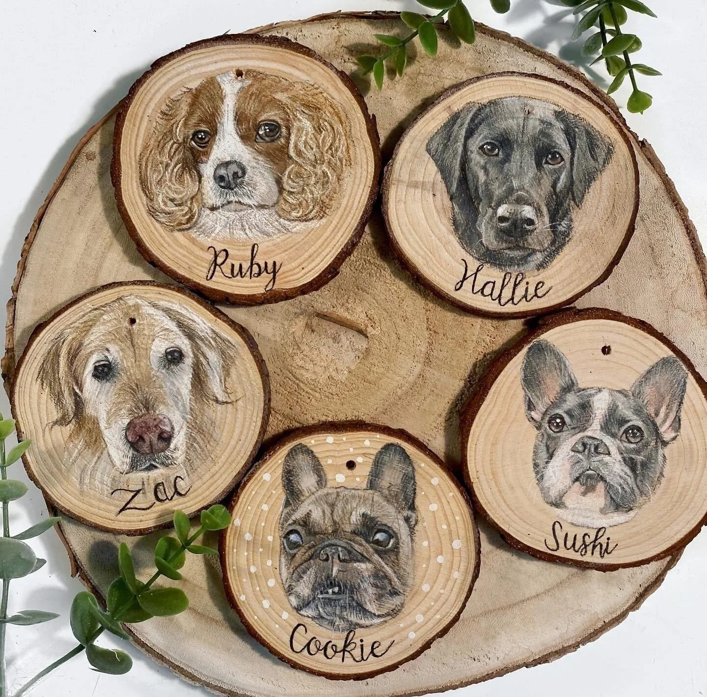 Hand drawn pet portrait decorations, created using primed wood slices, professional pencils and sealed with a gloss varnish. They are delivered with a piece of jute string and are sealed and protected for delivery.